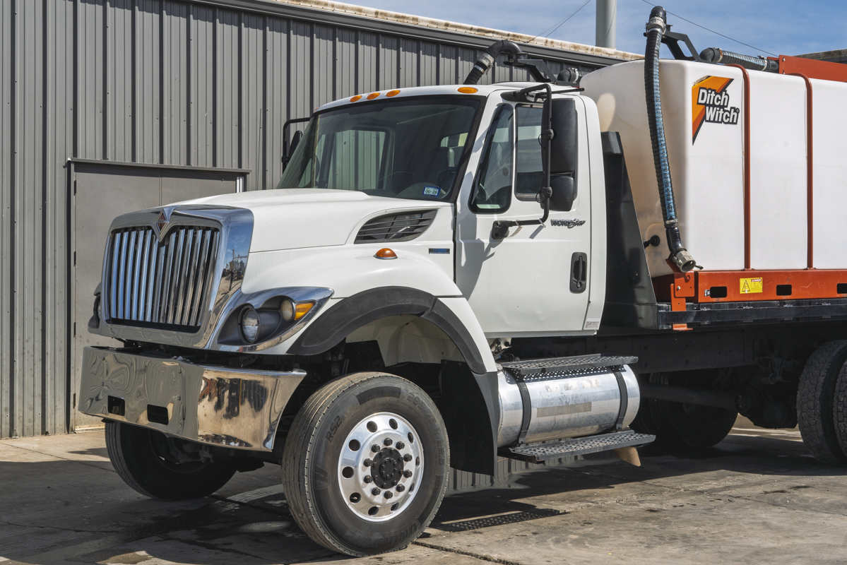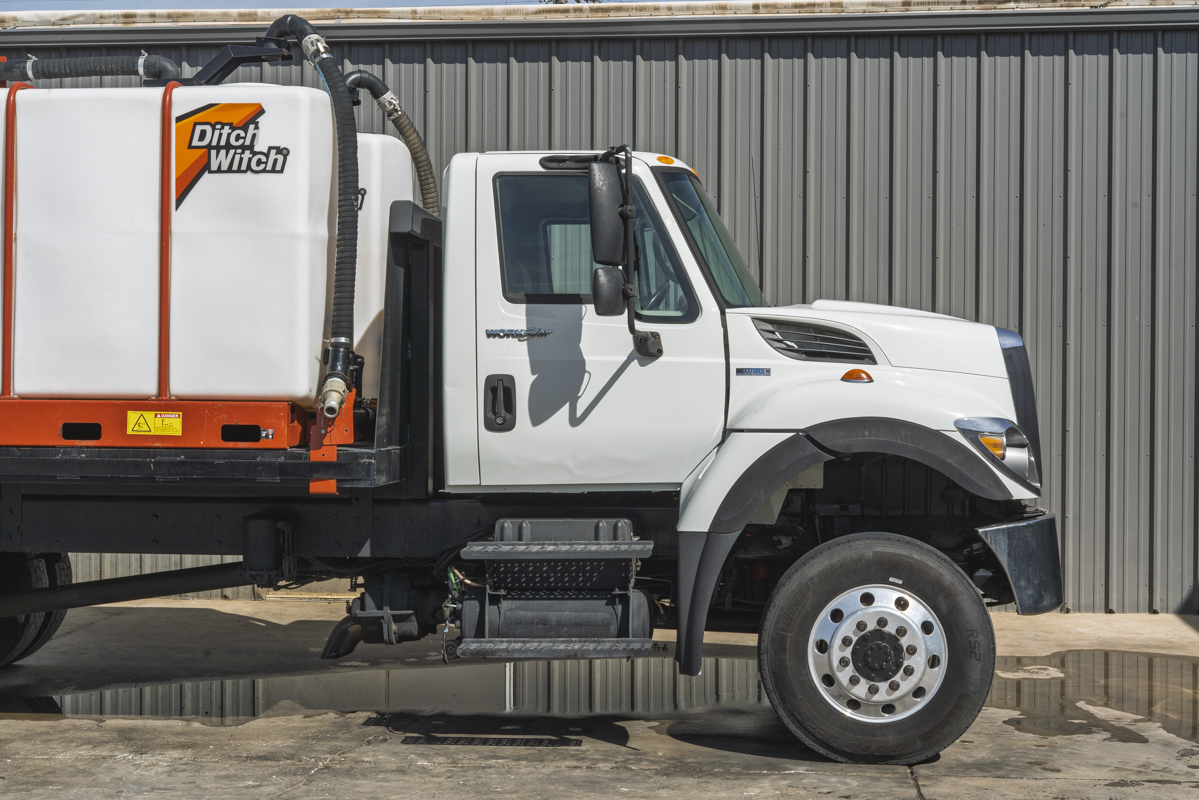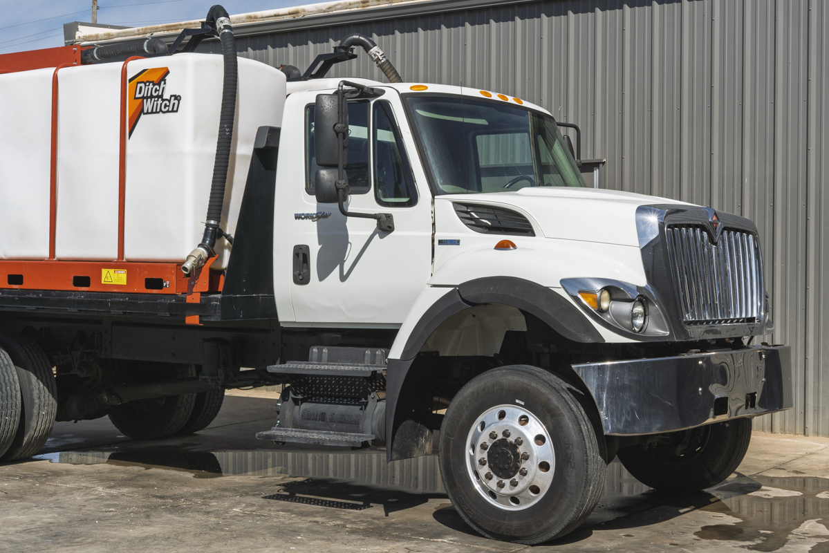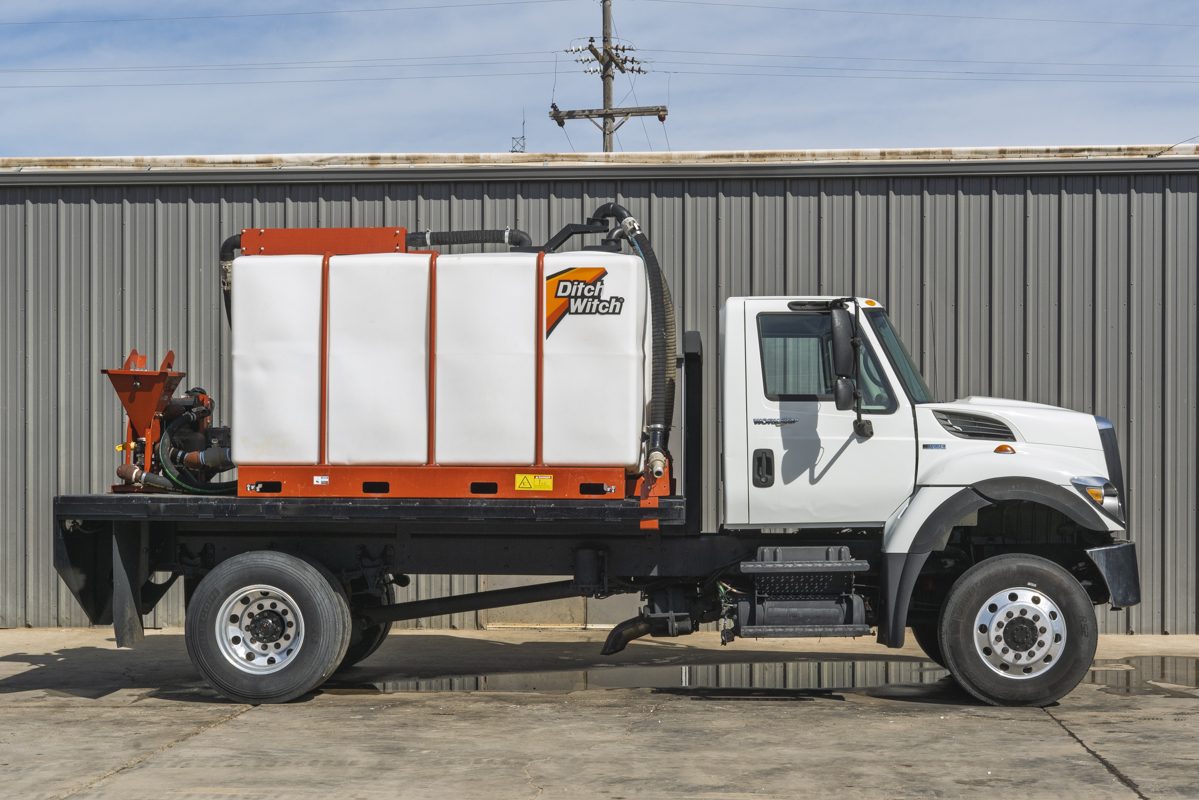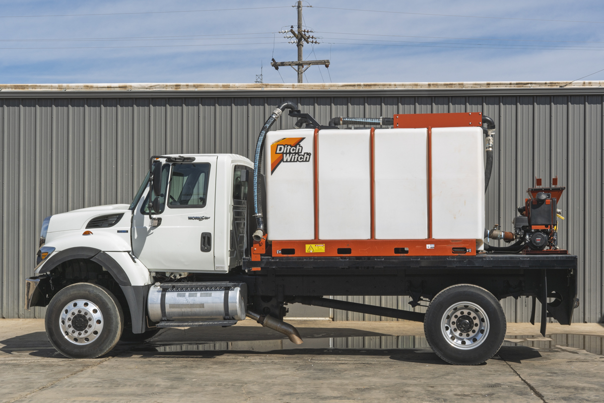 2011 International WorkStar 7500 4WD flat-bed mud mixing truck with 149,531 miles. This 2011 International WorkStar 7500 4-wheel-drive mud truck is powered by a 310 horsepower MAXXFORCE 10 9.3 liter diesel engine w/ 10-speed Eaton transmission, and rides on polished aluminum wheels. This mud truck has a 2021 Ditch Witch FM13x (SKU # 9300-811) mud mixing system with 405 hours, and two Ditch Witch 1,000-gallon tanks mounted on it's 14' flatbed.