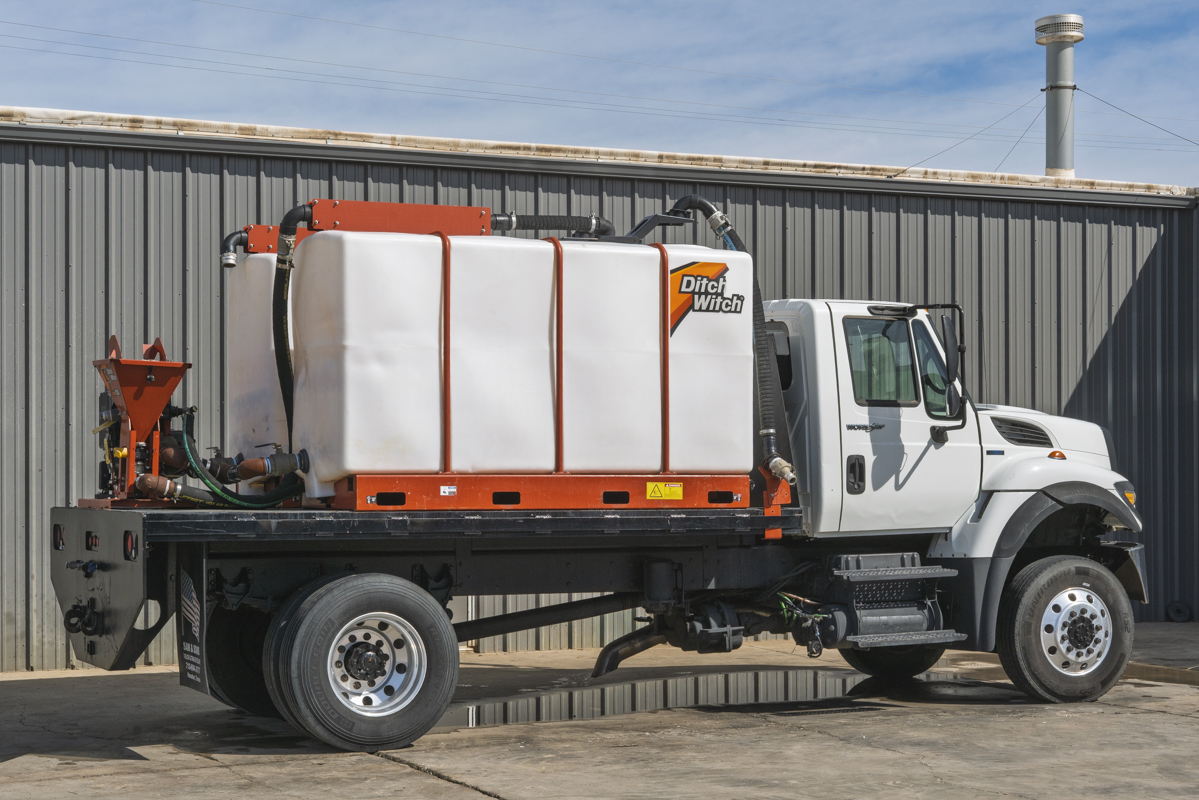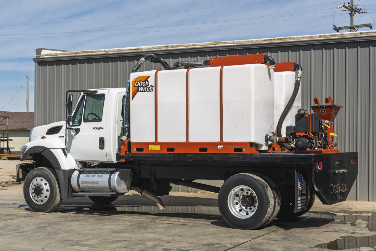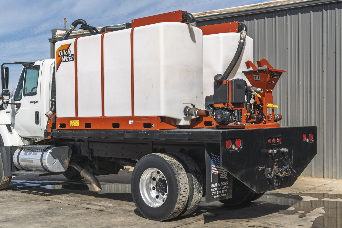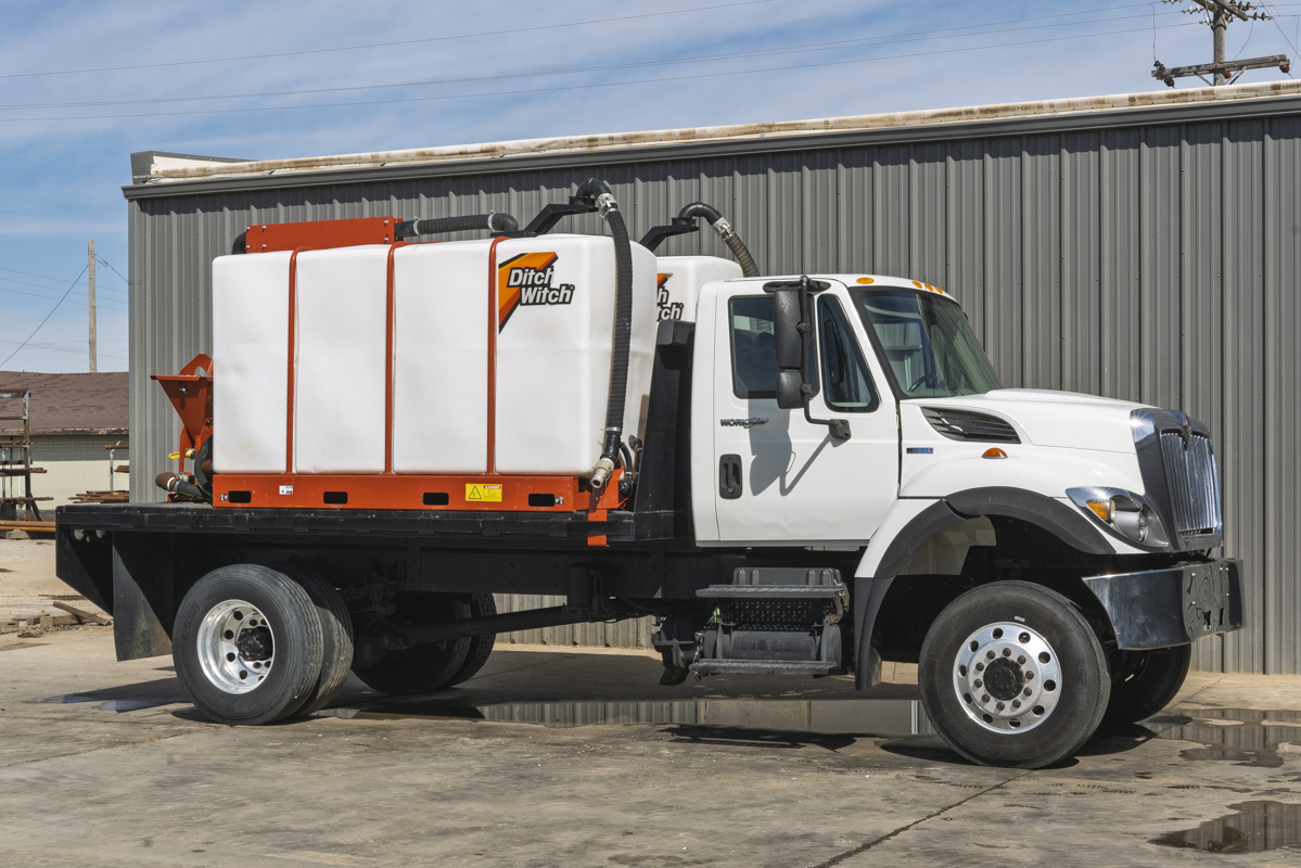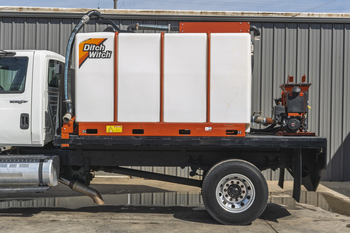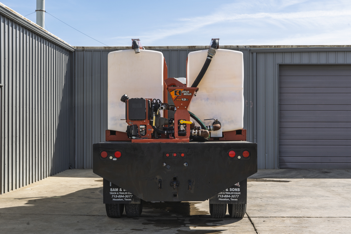 2011 International WorkStar 7500 4WD flat-bed mud mixing truck with 149,531 miles. This 2011 International WorkStar 7500 4-wheel-drive mud truck is powered by a 310 horsepower MAXXFORCE 10 9.3 liter diesel engine w/ 10-speed Eaton transmission, and rides on polished aluminum wheels. This mud truck has a 2021 Ditch Witch FM13x (SKU # 9300-811) mud mixing system with 405 hours, and two Ditch Witch 1,000-gallon tanks mounted on it's 14' flatbed.