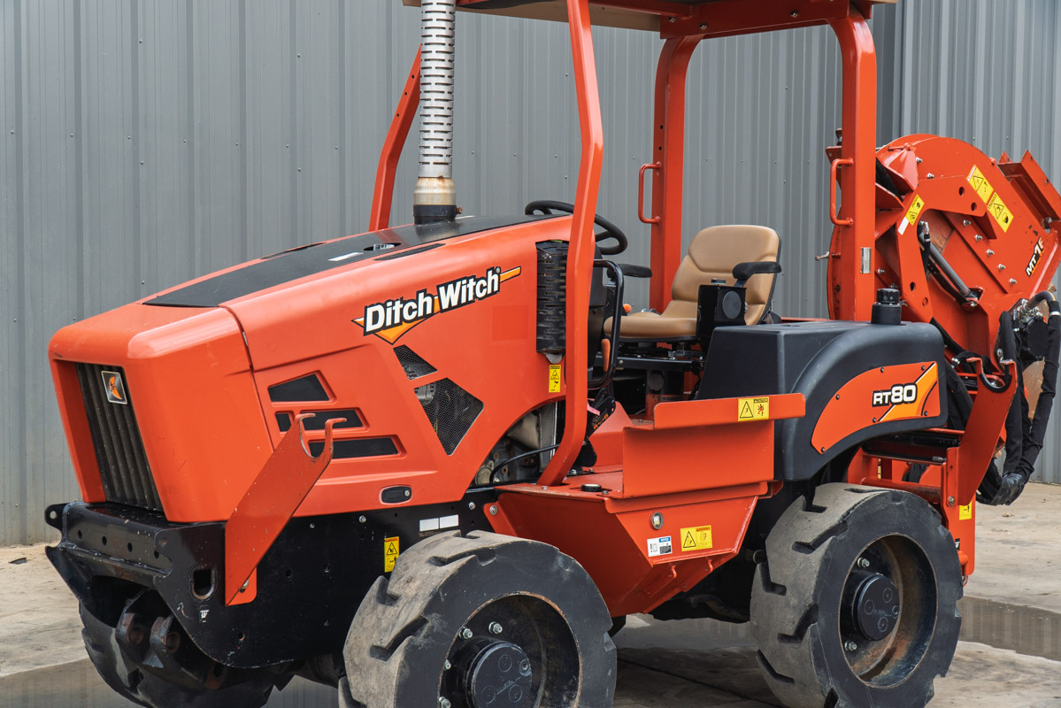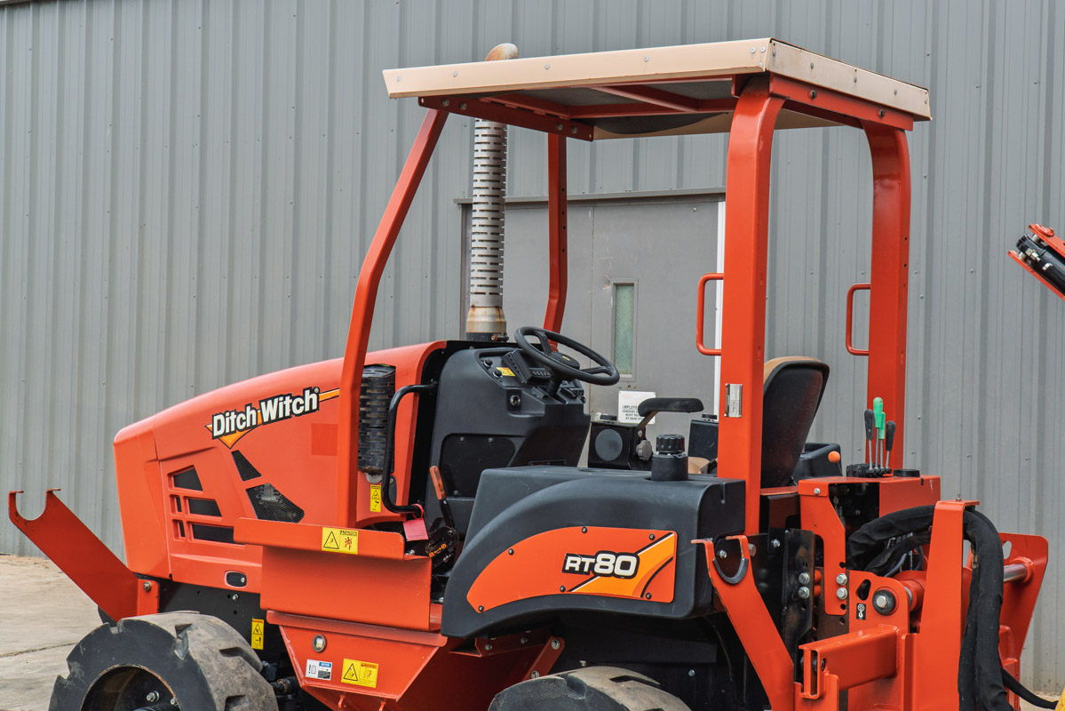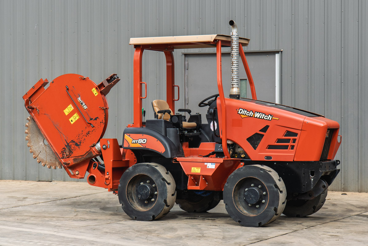 EXCELLENT condition. This RT80 has a 2017 Ditch Witch MT16 micro trencher attachment with a 1.5" blade. The power plant and fluid system will be fully serviced and inspected. This Ditch Witch RT80 will undergo a complete inspection of mechanical and hydraulic systems and will be functionally tested at our facility to ensure it meets our Ready-To- Work standards.